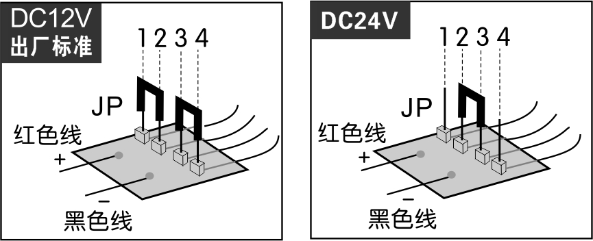 4、電磁門(mén)吸出廠時(shí)的標(biāo)準(zhǔn):工作電壓為DC12V 。如需使用在DC24V的系統(tǒng)中,請(qǐng)用跳線帽連接JP的第2腳與第3腳(如下圖調(diào)節(jié)方法)。