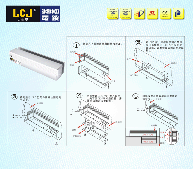 配合電插鎖EC200系列、EC200A系列、EC200B系列、EC200H鎖體,應(yīng)用于8~12mm厚上無框玻璃門(15mm玻璃特定) |